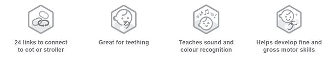 12 links included that can be connected to strollers or cots. Great for teething and play.
